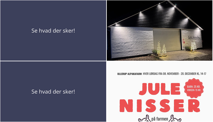 Tag på en magisk juleudflugt lørdag den 20. december på Ullerup Højgård Alpakafarm, hvor en hel landsby af nisser har slået sig ned. Fra kl. 14:00 kan du udforske nissernes hjem og deltage i sjove konkurrencer. Bagefter kan du slappe af i Alpa-Caféen med en varm drik, mens du nyder juledemning. Husk, at det er ikke tilladt at gå ind på græsgangene eller fodre alpakaerne.